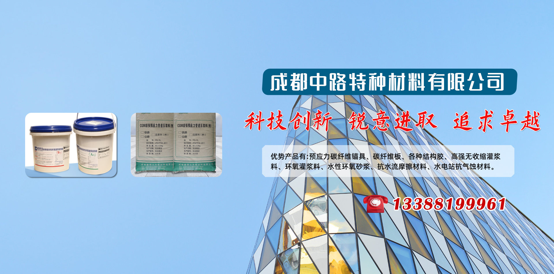 成都中路特種材料有限公司借助清華大學高分子材料學科、晨光化工研究院、西南交通大學、四川交通職業技術學院科研技術平臺成為一家集新材料研發、銷售、技術服務和施工于一體的專業服務公司,優勢產品有:預應力碳纖維錨具、碳纖維板、各種結構膠、高強無收縮灌漿料、環氧灌漿料、水性環氧砂漿、抗水流摩擦材料、水電站抗氣蝕材料和研發各種特殊用途膠黏劑產品地處西南腹地成都,業務覆蓋四川各大中小城市、重慶、云南、昆明、新疆、西藏等區域。產品涵蓋各種加固施工材料、施工設備及施工配件,品牌有威士邦等aa進口品牌,同時批發銷售國產高、中、低端品牌,為客戶提供全面參考。